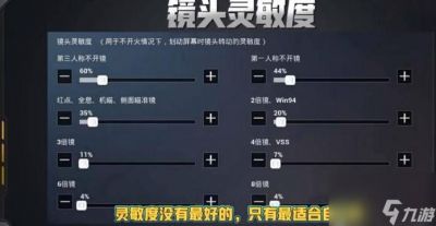 是开火灵敏度的设置。在第三人称不开镜的情况下,灵敏度调至145%,还有就是第一人称不开镜的灵敏度设置为125%。使用红点或全息瞄准器时,灵敏度为63%。2倍镜设置为61%,3倍镜为48%,4倍镜包括VSS为46%。如果使用6倍镜,灵敏度为33%,还有就是8倍镜则更低,设置为22%。